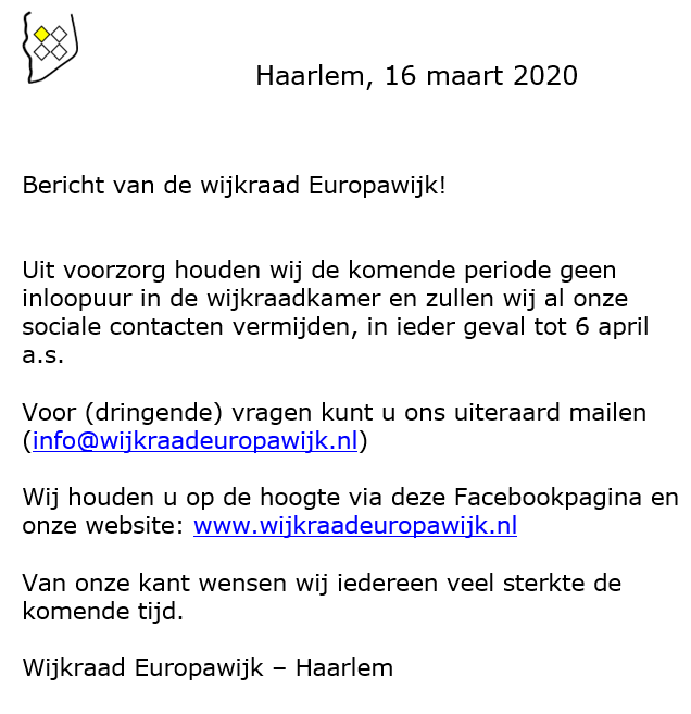 16 maart 2020 Algemeen Delen op social media Twitter Facebook LinkedIn Pinterest E-mail Wijkraad Europawijk