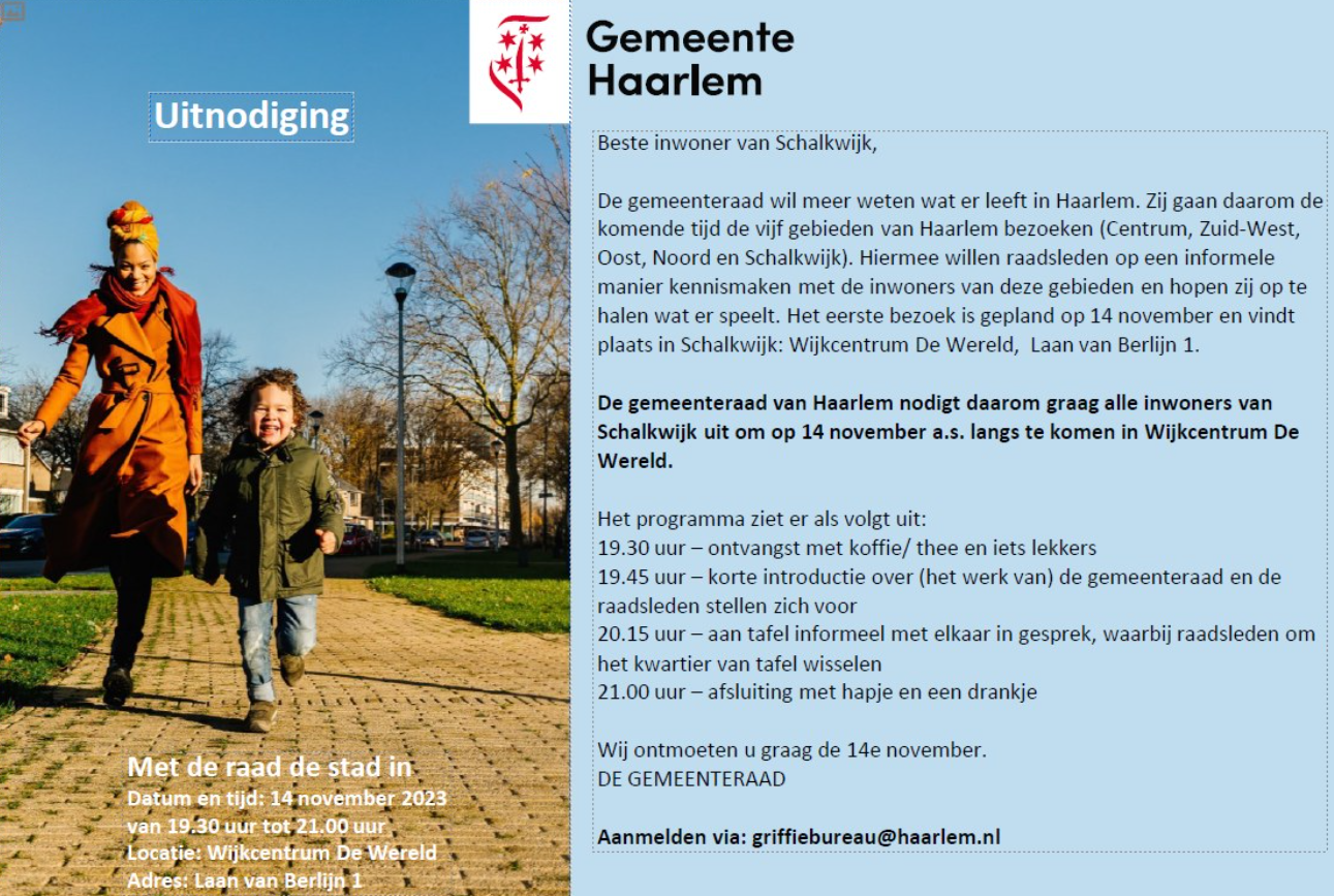 Omdat de gemeenteraad voor alle bewoners in Schalkwijk naar wijkcentrum de Wereld komt hebben wij besloten om daar ook heen te gaan en de wijkraadvergadering te laten vervallen. De volgende is dan op 14 december a.s.